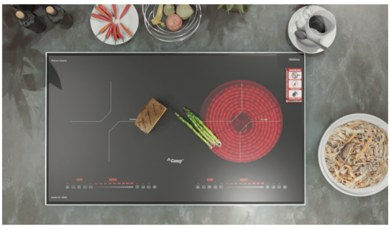 - Bếp đôi: 1 vùng từ + 1 vùng hồng ngoại sử dụng mặt kính Platinum Ceramic vát 4 cạnh bo viền nhôm sáng bóng, bo 4 góc sang trọng