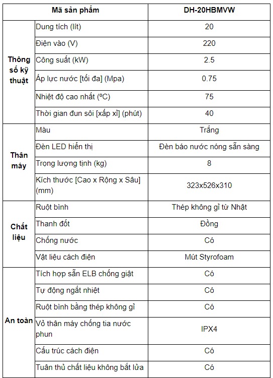 Máy nước nóng gián tiếp Panasonic DH-20HBMVW có thiết kế chữ nhật ngang đơn giản và trung tính dễ dàng kết hợp với mọi kiểu không gian nội thất của gia đình. Ruột bình chứa được làm từ thép cao cấp cho khả năng chống gỉ bền bỉ. Thanh đốt bằng đồng giúp hiệu quả truyền nhiệt tốt hơn, làm nóng nước nhanh chóng. Thiết bị là một chiếc máy cần thiết cho mọi gia đình, nhất là trong những ngày đông lạnh giá hay những ngày mưa tầm tã.