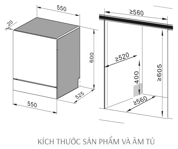 - Kích thước khoét tủ: 560x560x605mm (WxDxH)